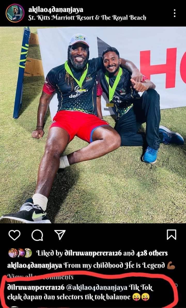 තරගයෙන් අනතුරුව අකිල ධනංජය විසින් ලෝක පූජිත ක්රීඩක ක්රිස් ගේල් සමග Instagram සමාජ මාධ්ය හරහා පල කල ඡායාරුවකට දිල්රුවන් පෙරේරා වෙනස්ම ආකාරයේ අදහසක් එක්කර තිබුනා.