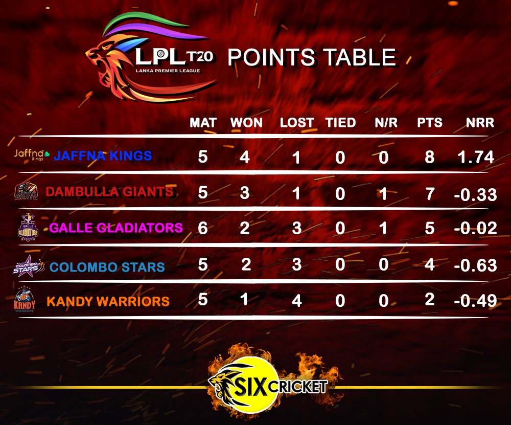 ඒ අනුව අද තරගයේ ජයග්‍රහණය Galle Gladiators කණ්ඩායමට හිමි වූ අතර මෙවර තරගාවලියේ Colombo Stars ජයග්‍රහණය කරන ලද තරග 2කම Galle Gladiators කණ්ඩායම් ට එරෙහිව ජයග්‍රහණය කර තිබීම විශේෂත්වයකි.