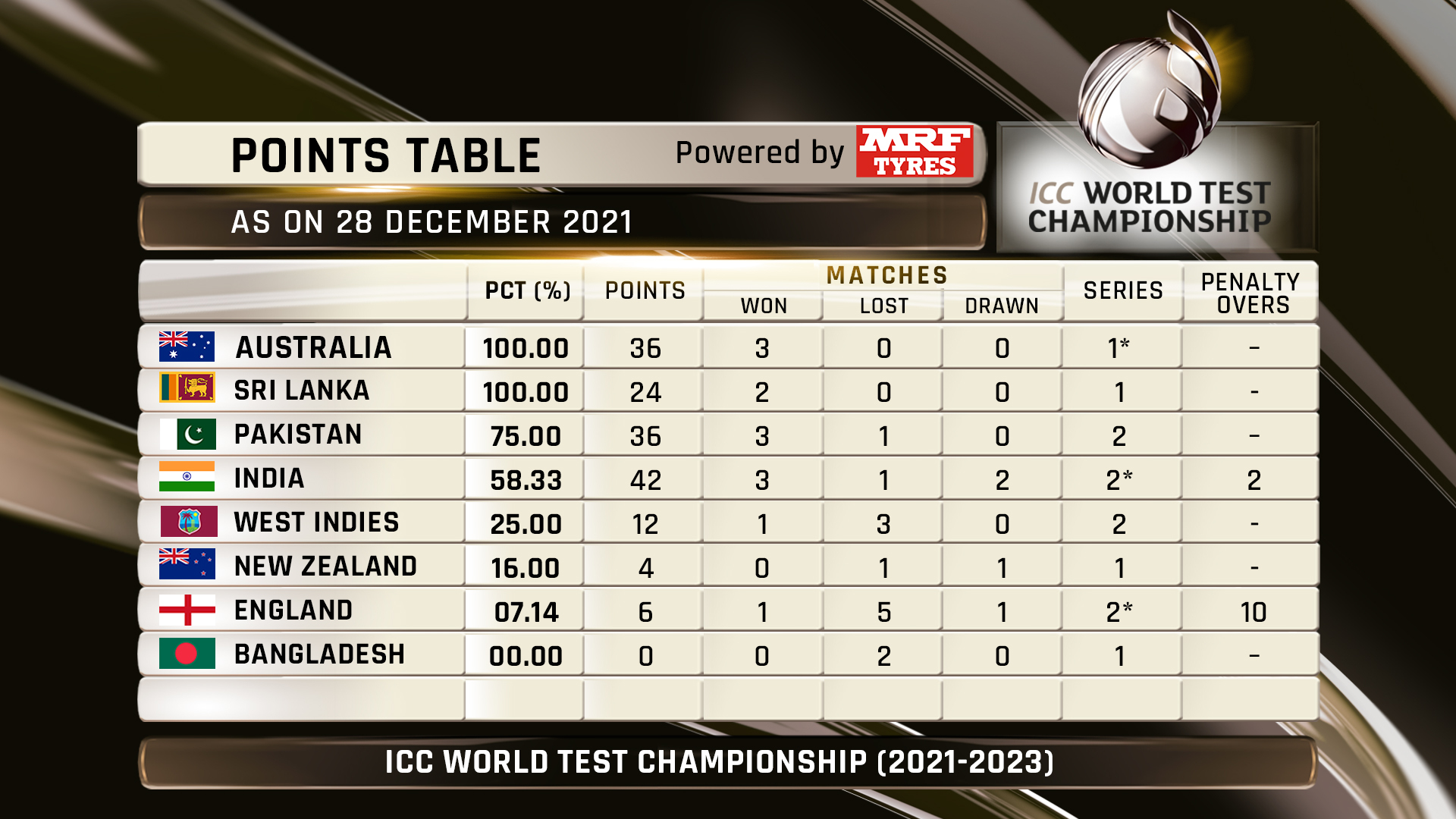 ඔස්ට්‍රේලියානු කණ්ඩායම මේ වන විට ප්‍රසාද ලකුණු සටහනෙහි 100%ක ලකුණු ප්‍රතිශතයක් සමගින් ප්‍රසාද ලකුණු 36ක් හිමිකරගෙන ඇති අතර මෙතෙක් ඔවුන් හා සම තත්වයේ පසු වූ ශ්‍රී ලංකා කණ්ඩායම 100% ක ලකුණු ප්‍රතිශතයක් සමග ප්‍රසාද ලකුණු 24 ක් ලබා දෙවන ස්ථානයේ පසුවනවා.