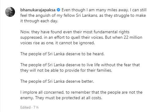 “මම සැතපුම් ගණනාවක් දුරින් සිටියත්, මගේ සහෝදර ශ්රී ලාංකිකයන් සෑම දිනකම ජය ගැනීමට අරගල කරන විට ඔවුන්ගේ වේදනාව මට දෙන්නව, දැන්, ඔවුන්ගේ හඬ යටපත් කිරීමේ උත්සාහයක් ලෙස, ඔවුන්ගේ මූලික අයිතිවාසිකම් පවා යටපත් කර තිබෙනවා. නමුත් මිලියන 22 ක හඬක් එක ලෙස නැඟෙන විට එය නොසලකා හැරිය නොහැකිය. ශ්රී ලංකාවේ මිනිසුන්ට ඇහුම්කන් දිය යුතුයි. ශ්රී ලංකාවේ ජනතාව සතුරන් නොවන බව මතක තබා ගන්නා ලෙස අදාළ සියලු දෙනාගෙන් ඉල්ලා සිටිනවා.”