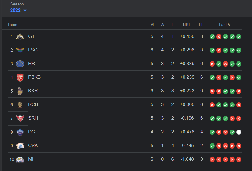 මේ අතර අද තරගාවලියේ 26වන තරගය ලෙස Lucknow Super Giants කණ්ඩායම සහ Mumbai Indians කණ්ඩායම් අතර පැවති තරඟයෙන් ලකුණු 18ක ජයක් හිමිකර ගැනීමට Lucknow Super Giants කණ්ඩායම සමත් වුනා.