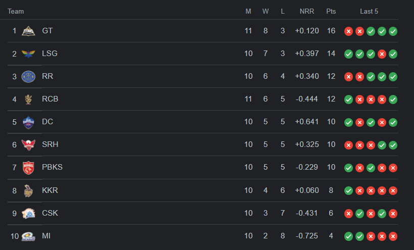 මේ අතර අද තරගාවලියේ 51න තරගය ලෙස Mumbai Indians කණ්ඩායම සහ Gujarat Titans කණ්ඩායම් අතර පැවති තරඟයෙන් ලකුණු 5ක තියුණු ජයක් හිමිකර ගැනීමට Gujarat Titans කණ්ඩායම සමත් වුනා.