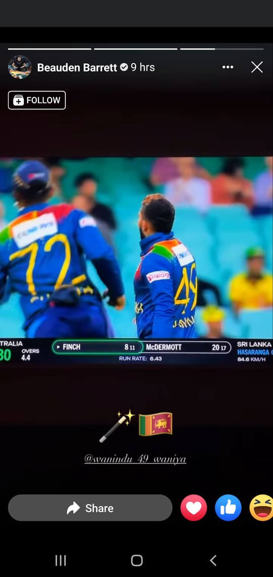 රග්බි ලෝක ශුර නවසීලන්ත කණ්ඩායමේ Beauden Barrett සිය ප්රියතම ක්රිකට් ක්රිඩකයකු වන වනිඳු හසරංග ගැන තැබු සටහන.!