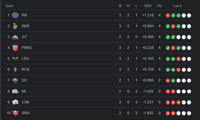මේ අතර අද තරගාවලියේ 13වන තරගය ලෙස Rajasthan Royals කණ්ඩායම සහ Royal Challengers Bangalore කණ්ඩායම් අතර පැවති තරඟයෙන් කඩුලු 4ක ජයක් හිමිකර ගැනීමට Rajasthan Royals කණ්ඩායම සමත් වුනා.