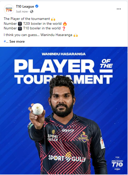ලොව වේගවත්ම තරඟාවලිය වන T10 තරඟාවලියේත් සිංහ අණසක පැතිරවූ “වනිඳු හසරංග” හට තරඟාවලියේ වීරයා සම්මානය හිමිවෙයි.!