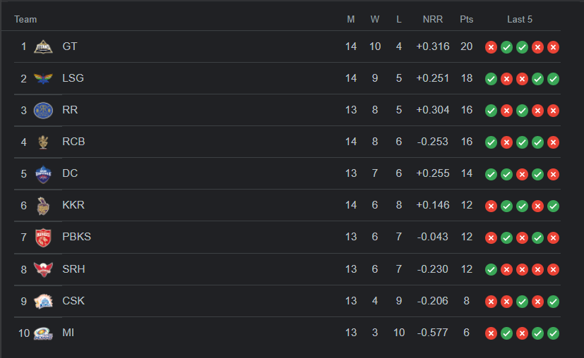 මේ අතර අද තරගාවලියේ 67වන තරගය ලෙස වනිඳු හසරංග ක්රීඩා කරන Royal Challengers Bangalore සහ Gujarat Titans කණ්ඩායමත් අතර පැවති තරඟයෙන් කඩුලු 8ක් විශිෂ්ට ජයග්රහණයක් වාර්තා කරමින් මෙවර තරඟාවලියේ අවසන් වටය පිළිබඳව තවදුරටත් බලපොරොත්තු රඳවා ගැනීමට Royal Challengers Bangalore අද සමත් වුනා.