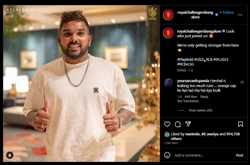 එය මෙවර තරඟාවලිය ආරම්භ වූවාට පසු RCB Instagram ගිණුමේ තැබූ ඡායාරූපයකට ලැබුණු ඉහළම LIKE සංඛ්යාවයි.