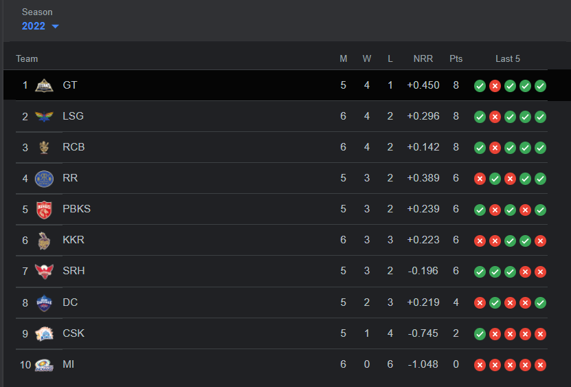 මේ අතර අද තරගාවලියේ 27වන තරගය ලෙස Royal Challengers Bangalore කණ්ඩායම සහ Delhi Capitals කණ්ඩායම් අතර පැවති තරඟයෙන් ලකුණු 16ක ජයක් වාර්තා කරමින් ප්රසාද ලකුණු සටහනේ තෙවන ස්ථානය දක්වා ඉදිරියට පැමිණීමට RCB කණ්ඩායම අද සමත් වුනා.