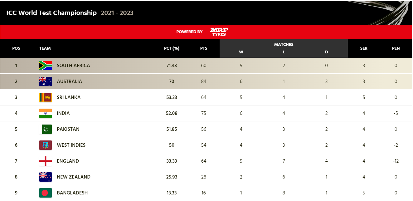 නවතම ටෙස්ට් ලෝක ශුරතා ප්රසාද ලකුණු සටහන පහතින්